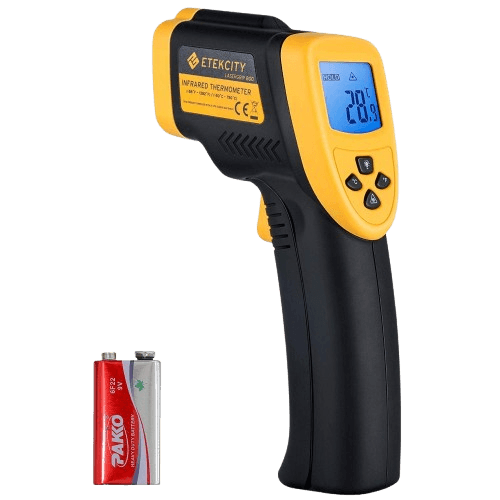 The Etekcity Lasergrip 800 is a popular choice for home cooks who want performance without the price. It has a wide temperature range of -50°C to 750°C and a 16:1 distance-to-spot ratio for safer measurements from farther away. Built-in laser pointer for easy aiming and adjustable emissivity for different materials. Backlit LCD display for dim kitchens and auto-off to save battery. Lightweight and user friendly for checking cast iron pan heat to grill temperatures.